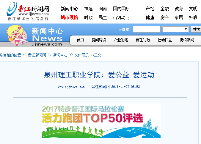 泉州理工学院百名学子加盟晋马 爱公益 爱运动 为爱而跑 晋江新闻网10月27日讯 2017特步晋江国际马拉松赛吸引了无数在校学子的目光,其中就包括来自晋江本土高校泉州理工职业学院的百余名跑步爱好者。...