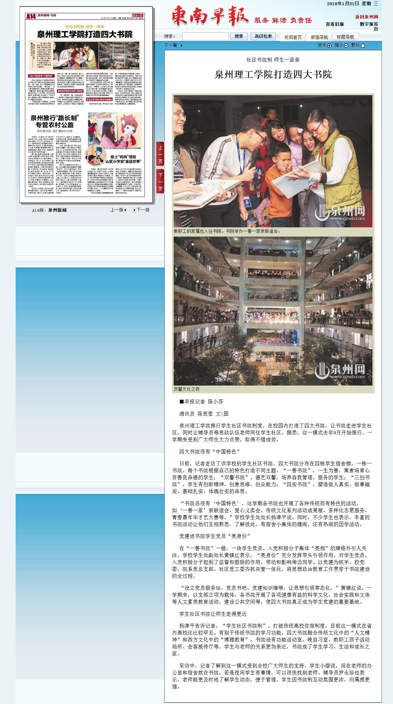 泉州理工学院推行学生社区书院制度,在校园内打造了四大书院,让书院走进学生社区,同时让辅导员等思政队伍老师同住学生社区。据悉,这一模式去年9月开始推行,一学期来受到广大师生大力点赞,取得不错成效。 四...