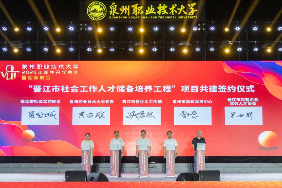 10月16日,泉州职业技术大学党委与晋江市委社会工作部、泉州市高教发展中心、晋江市民营企业党务人才协会、晋江市社会工作协会共建签约,启动“晋江市社会工作人才培养工程”。“晋江市社会工作人才培养工程”项目共建签约仪式晋江市委社会工作部、非公有制企业和社会组织工委有关领导同志为泉州职业技术大学颁授“晋江市社会工作人才培训基地”和“晋江市‘两企三新’党务人才培训基地”牌匾。共建仪式上,泉州职业技术大学党...