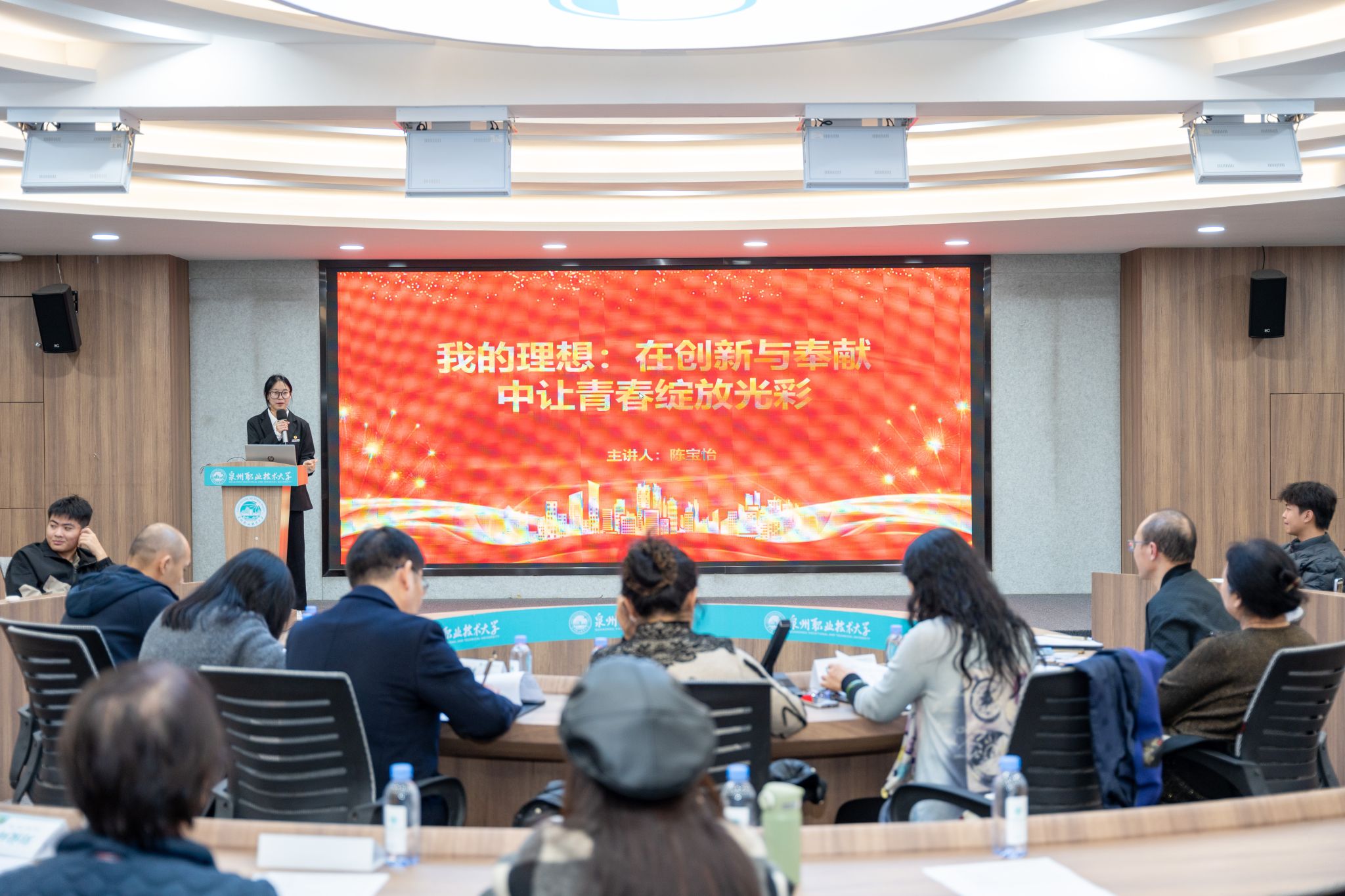 12月17日,泉州职业技术大学“我的理想——在泉大绽放青春”演讲比赛决赛于A301会议室举行。比赛旨在落实“大思政”育人理念,引导学生将个人理想融入学校发展与时代洪流,吸引了众多2025级新生积极参与。赛事采用“线上初赛+线下决赛”相结合的形式。初赛阶段,各书院学生通过线上视频踊跃投稿,经选拔,共有12名选手脱颖而出晋级决赛。决赛现场,选手们围绕“我的理想”与“校园文化”两大主题,以饱满的热情讲述成长故事、抒...