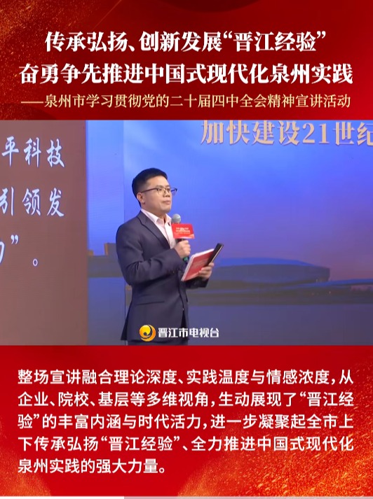 为深入学习贯彻党的二十届四中全会、省委十一届九次全会及泉州市委十三届十次全会精神,持续深化拓展“深学争优、敢为争先、实干争效”行动,12月24日,“传承弘扬、创新发展‘晋江经验’奋勇争先推进中国式现代化泉州实践——泉州市学习贯彻党的二十届四中全会精神宣讲活动”在晋江融媒体中心开讲。 活动中,我校马克思主义学院思政教师周文龙以《数智赋能 产教共舞——泉职人在“晋江经验”引领中的“双向奔赴”》为题作宣讲...