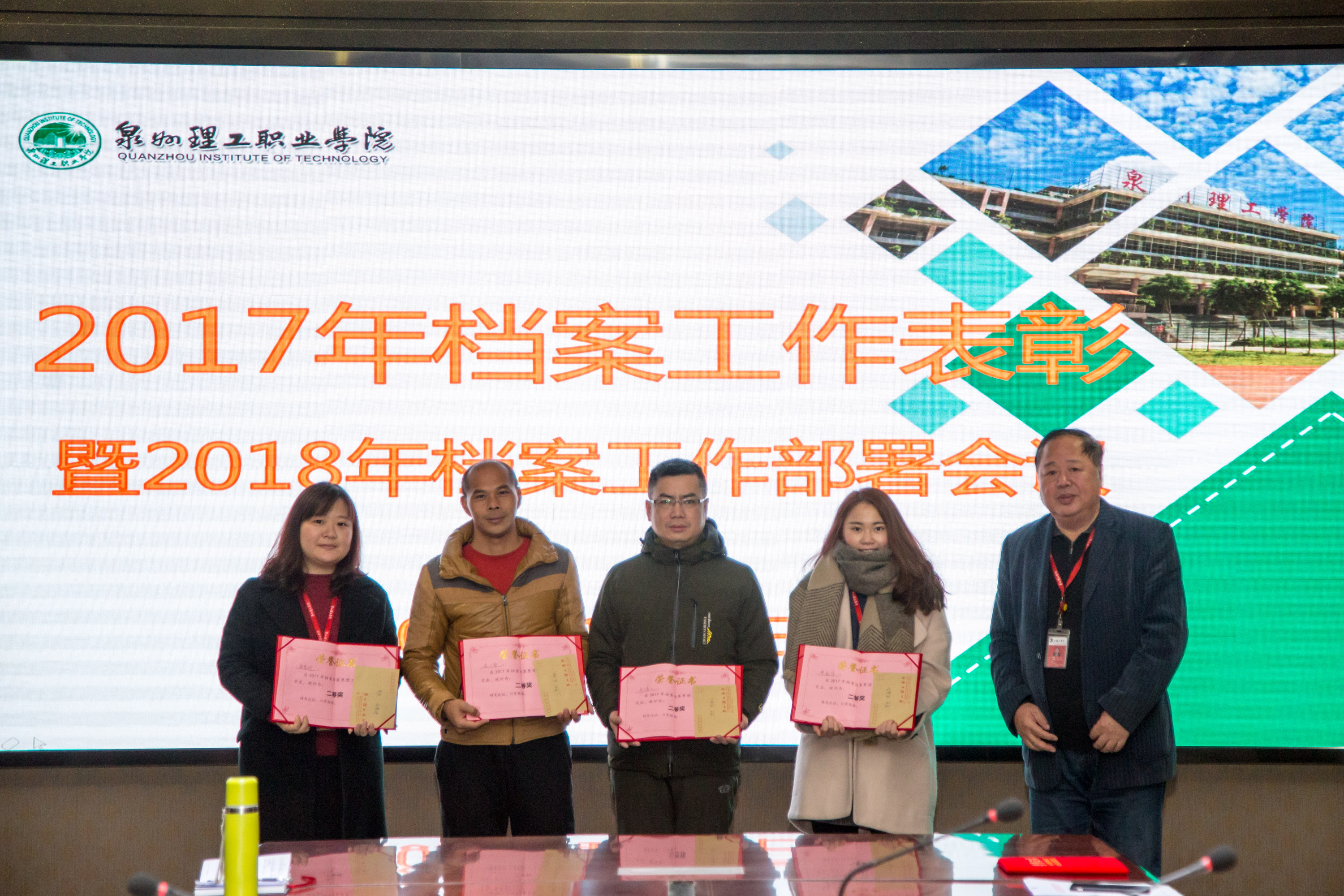 臧校长、林文艺主任、校长助理郭霏霏为受表彰的兼职档案员颁奖,希望受表彰的同志们戒骄戒躁,进一步做好今后的档案工作,为学校永续长远发展做出贡献。
