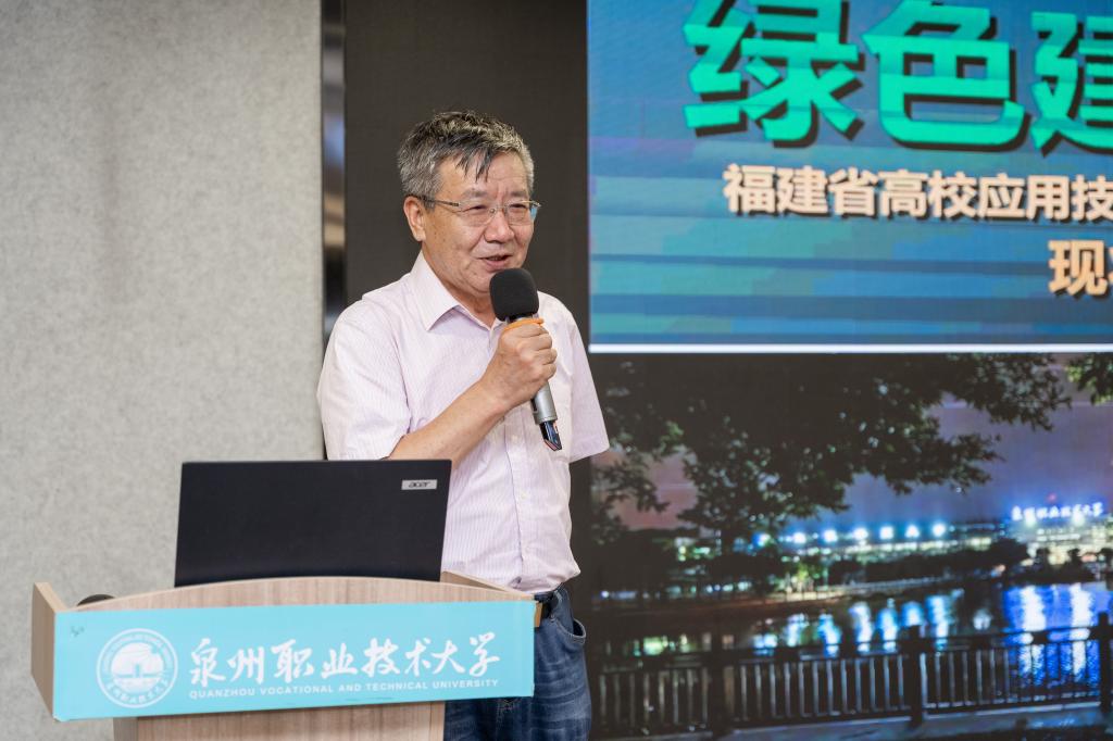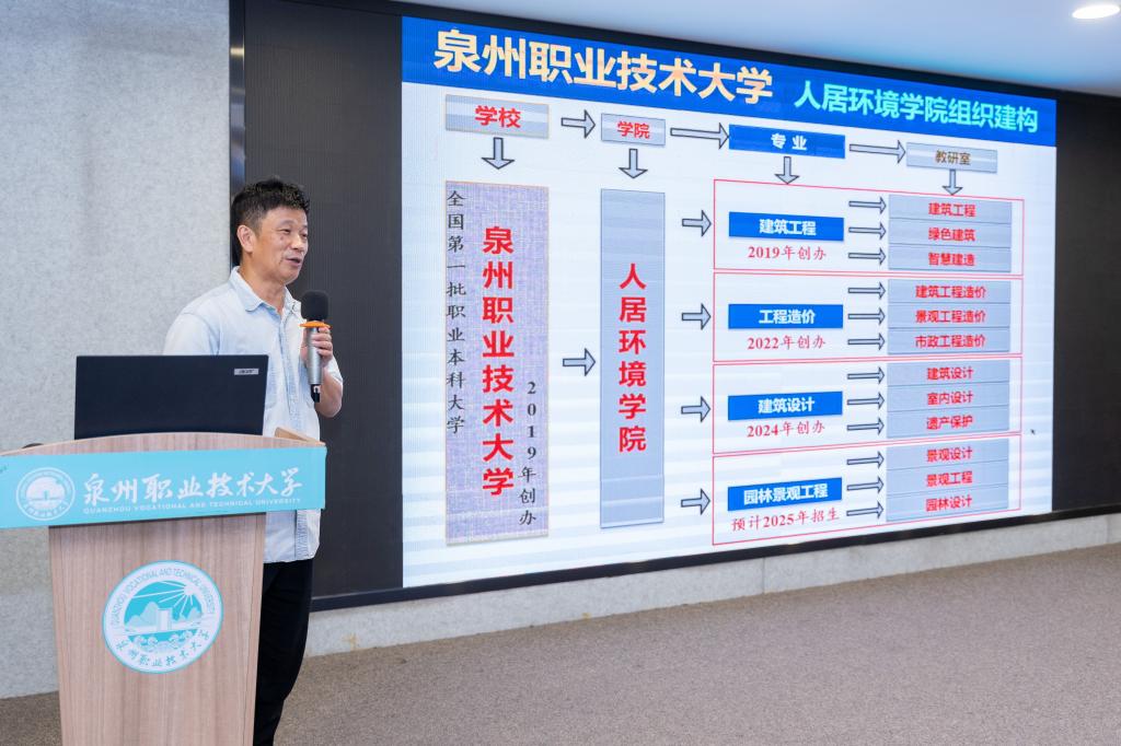 8月14日下午,泉州职业技术大学举办“转型期背景下绿色建筑与职业教育”研讨会。会议特邀天津大学建筑学院原书记、澳门城市大学博士生导师张玉坤教授,福州大学建筑学院副院长、博士生导师林志森教授,黎明职业大学土木建筑工程学院丁瑜鸿教授等嘉宾。泉州职业技术大学党委书记傅志雄,科研处处长任莉娟,人居环境学院院长关瑞明、书记兼副院长张艺能、环境艺术设计专业带头人陈力、环境艺术设计专业主任陈淼淼、建筑室内设计专业主任叶加根,以及相关专业教师和学生参加会议。