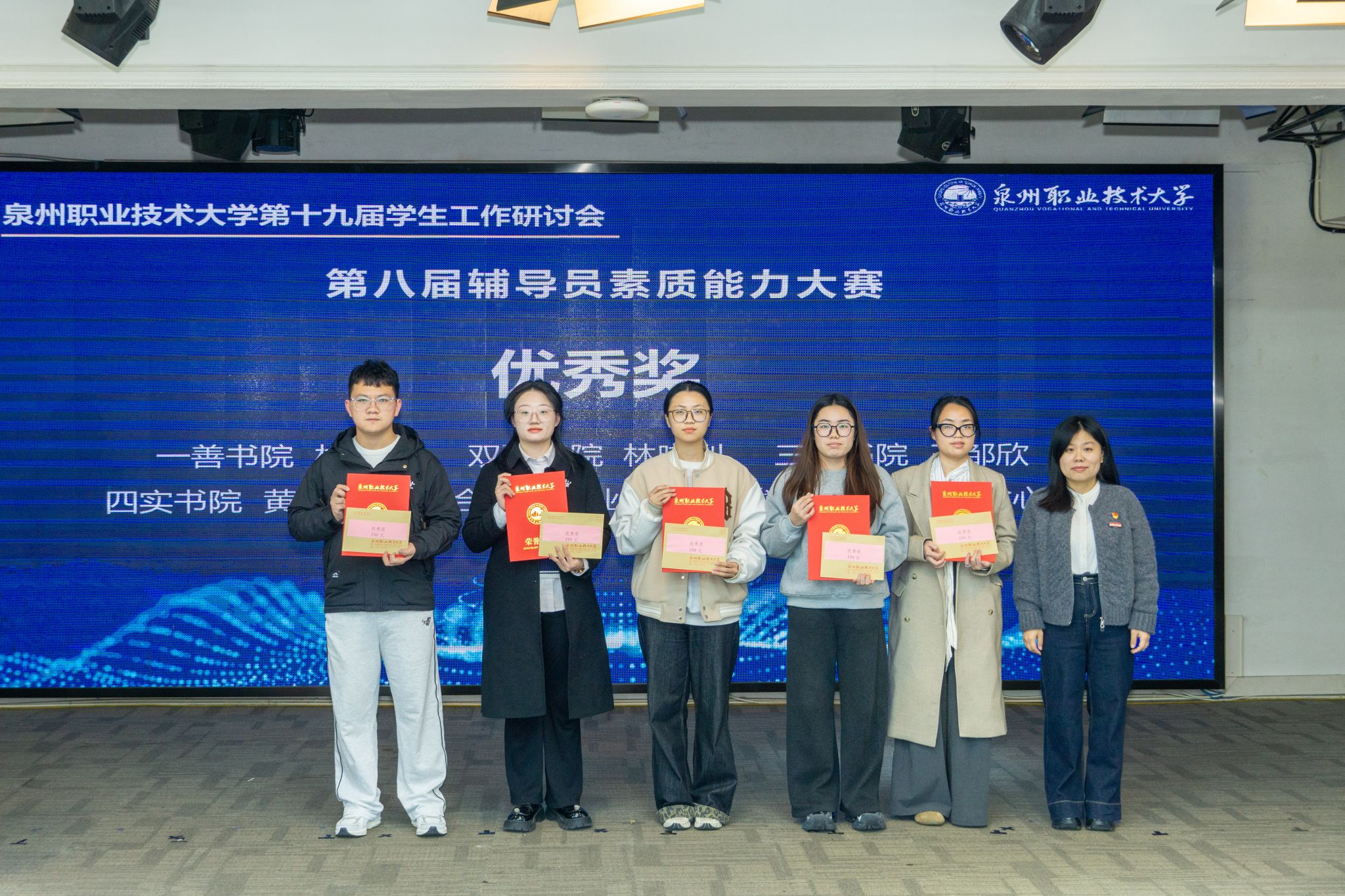 12月24日,迎来了研讨会的成果汇报及专项表彰。校党委书记傅志雄,校党委副书记、副校长蔡金佩,校工会主席陈其生,人事处、学工处、校团委负责人,各学院、书院主要负责人及全体辅导员、班主任参会。会议由学工处副处长朱冰梅主持。