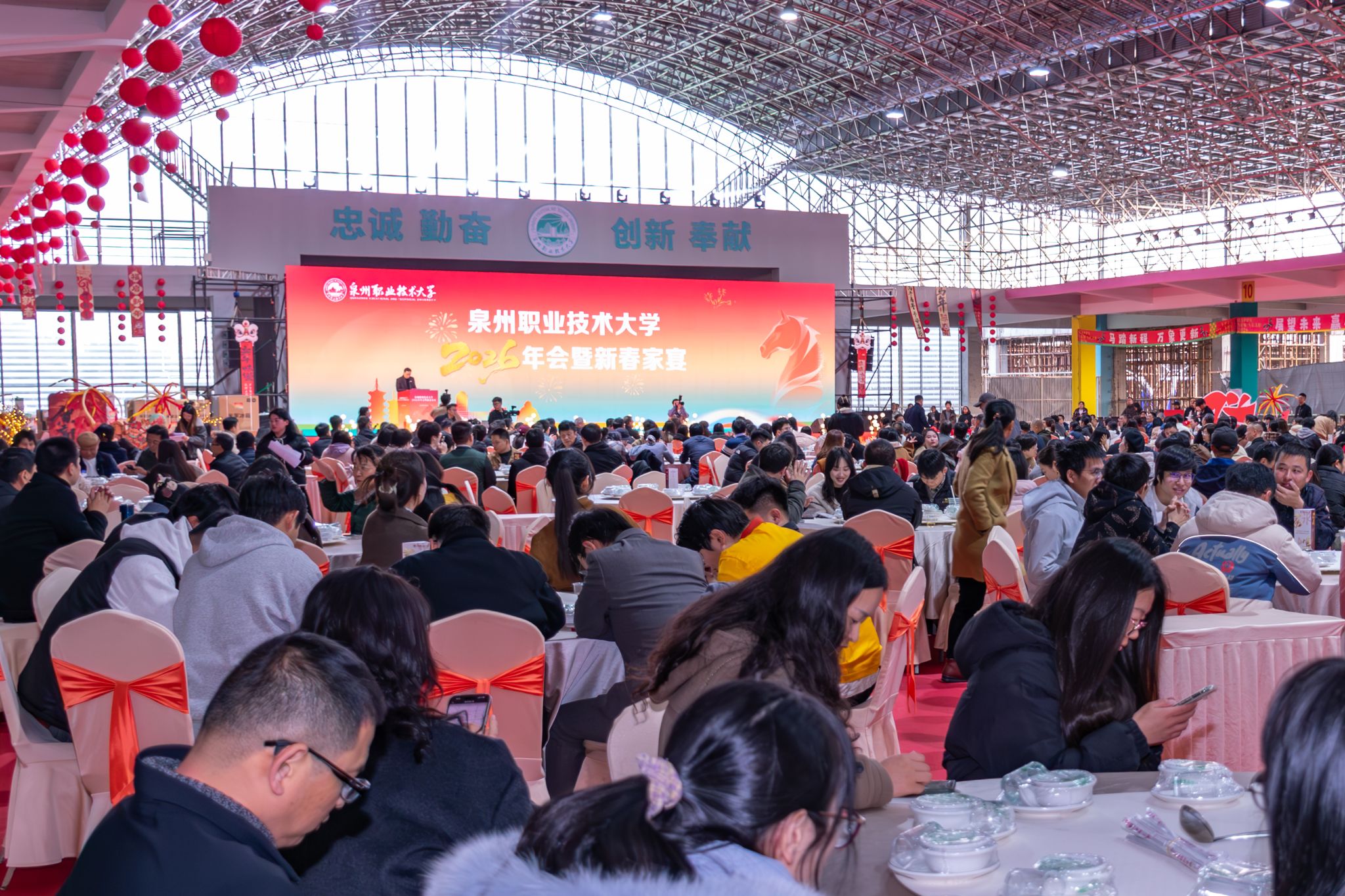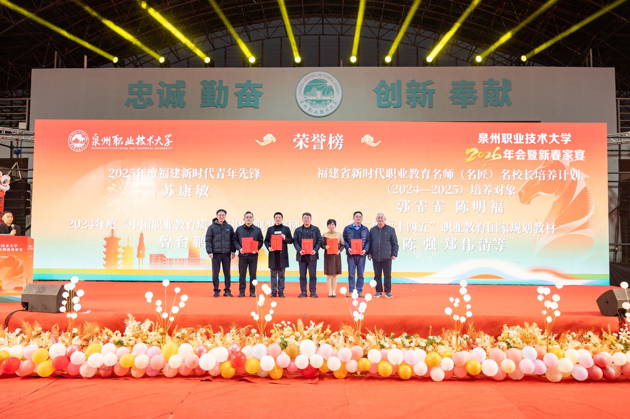 1月20日,泉州职业技术大学隆重举行2026年会。学校创办人、董事长吴金营,泉大教育基金会理事长杨培琛,校长吴滨如,党委书记傅志雄,全体校领导、教职工及产业伙伴代表、南非培训学员参加。年会由傅志雄书记主持。