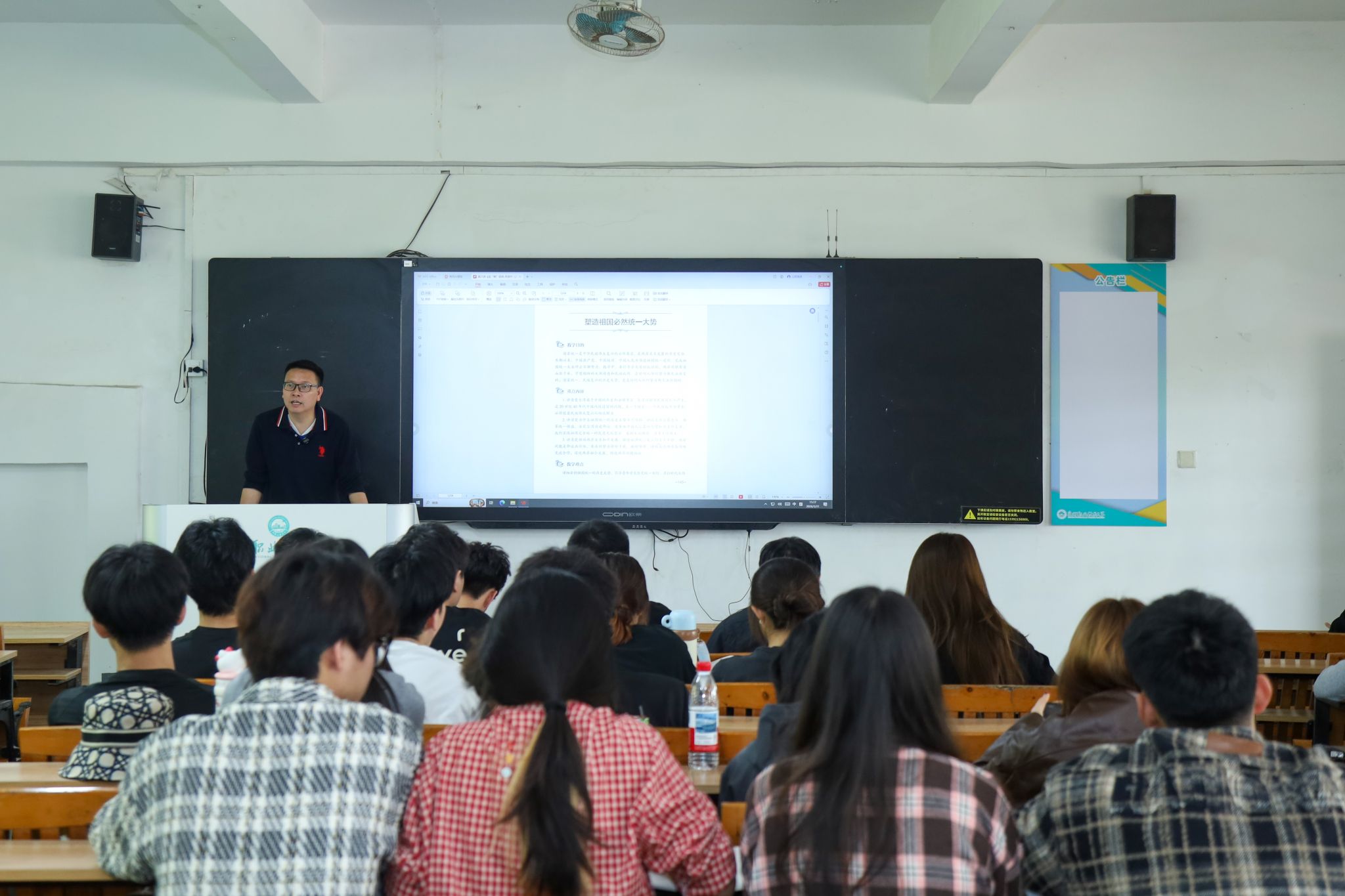 课堂上,林文艺从历史定论、法理基础、民心支撑三个核心维度出发,系统梳理了祖国统一的历史逻辑与法理依据。他结合两岸经贸往来、惠台政策落地、闽台文化交融等鲜活案例,深入阐释“反独促统”的时代内涵与实践要求,引导同学们深刻认识到:一个中国原则不容动摇,祖国完全统一是大势所趋、民心所向。