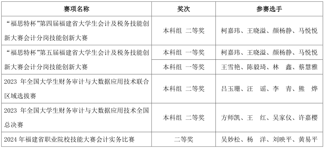 课堂外,每年,他都带同学们参加各种专业比赛,并取得累累硕果:2023年全国大学生财务审计与大数据应用技术全国总决赛本科组二等奖、2024年福建省职业院校技能大赛会计实务比赛二等奖、“福思特杯”第四届福建省大学生会计及税务技能创新大赛会计分岗技能创新大赛本科组二等奖、“福思特杯”第五届福建省大学生会计及税务技能创新大赛会计分岗技能创新大赛本科组一等奖……