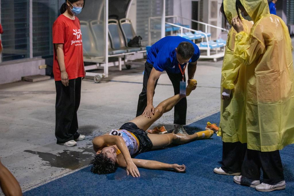 赛场上,健儿紧张拼搏。赛场下,休闲体育专业老师章天宇、王雨轩,正带着学生为健儿们做运动康复。