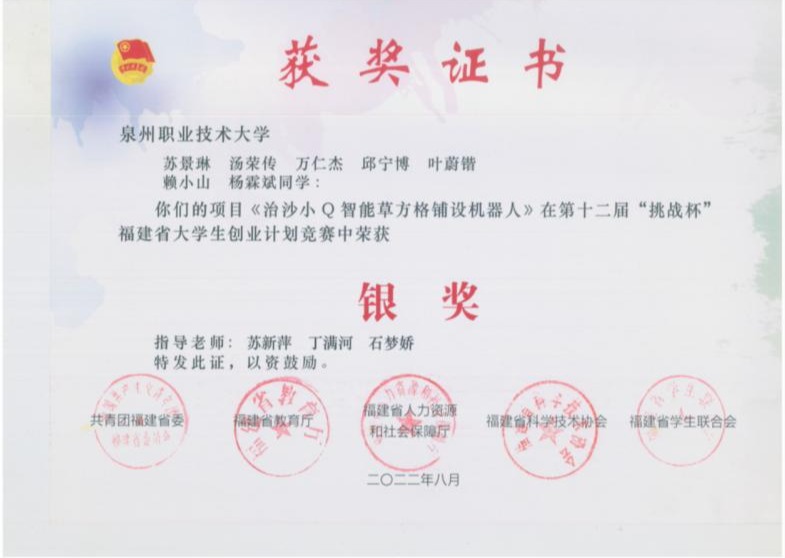 从此,他在科研路上不断探索,频频收获各种奖项。苏老师记得,他不仅主动竞选班长,更在各类科研比赛中积极报名,仿佛每一场比赛都是他向未知挑战的舞台,而他总能以优异成绩凯旋。2021年5月,在第十四届全国大学生先进成图技术与产品信息建模创新大赛”暨“第一届福建省大学生先进成图技术与产品品信息建模创新大赛”3D打印赛获省二等奖;2021年8月,在第七届福建省“互联网+”大学生创新创业大赛职教赛道暨第五届黄炎培海峡职业教育创新创业大赛获铜奖;2022年5月,在第十五届全国大学生先进成图技术与产品信息建模创新大赛”暨“第二届福建省大学生先进成图技术与产品品信息建模创新大赛”3D打印赛获二等奖……