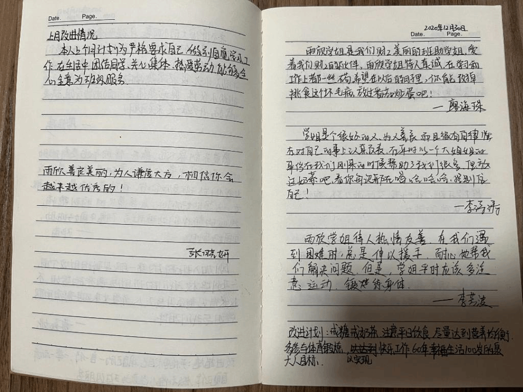 此后,她在“成才笔记”里记下了这一次的“成长”——本人上月计划养成良好饮食习惯,做到了一日三餐有规律进食,适量加餐补充低脂肪的碳水化合物,并辅以运动,保证身体健康。