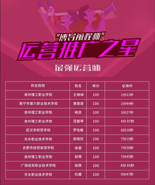 我校池轶鹏在第二场比赛中,以16秒满分的成绩获得“运营推广之星”称号,卓秋芬在第三场比赛中,以11秒满分的成绩获得“运营推广之星”称号;王绵绵、杨蕊、范碧琴、赵辉获“最强运营师”称号;庄沈洋、林佩芳获“活力运营师”称号。指导老师:郭学超。