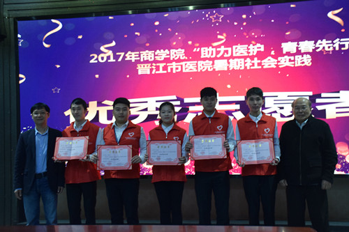 1、2018年3月15日早上10点,在泉州理工学院第一会议室举行“2017年商学院助力医护,青春先行晋江市医院暑期社会实践表彰大会”。晋江医院党委书记黄东昭先生非常感谢和我校的共建,同学们的辛苦付出也是卓有成效的,希望接下去我们的共建项目和方向更加的多元化,更好的服务晋江,更好的促进志愿服务工作的开展。暑期社会实践晋江市医院主要负责人詹曼艺副主任为本次志愿服务做总结讲话。她说道,同学们的暑期社会实践给医院带去了活力,服务的过程中提出了一些建设性的意见,更好的完成了志愿服务工作,进一步缓解了医患的关系。与此同时,同学们在为期一个月的暑期社会实践,收获了成长,积攒了经验,提高了沟通协调的能力,同时得到很大的蜕变。会议中表彰了在暑期社会实践中表现突出的优秀志愿者。