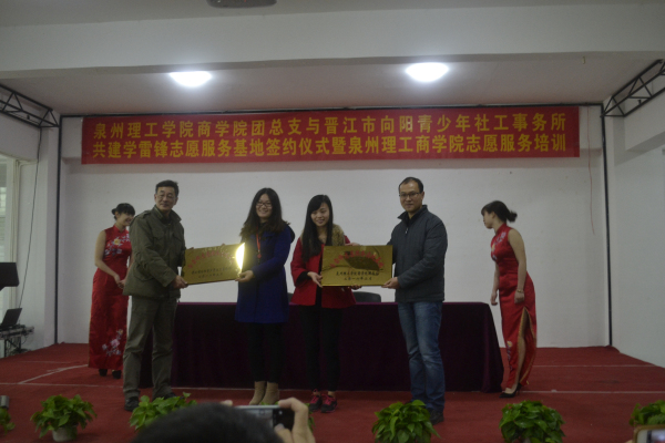 在会上,晋江市委宣传部副部长陈多多向商学院团总支授“学雷锋志愿服务实践基地”牌。
